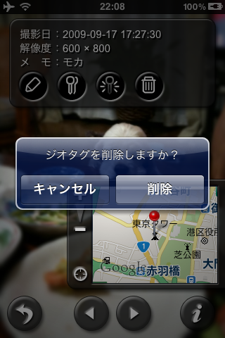 PCとケーブル接続した状態で本アプリによるジオタグ編集を行った場合、編集した写真をiPhotoで正しく読み込めなくなることがありますが、ケーブルを抜き差しすることで正常な状態に戻ります。
